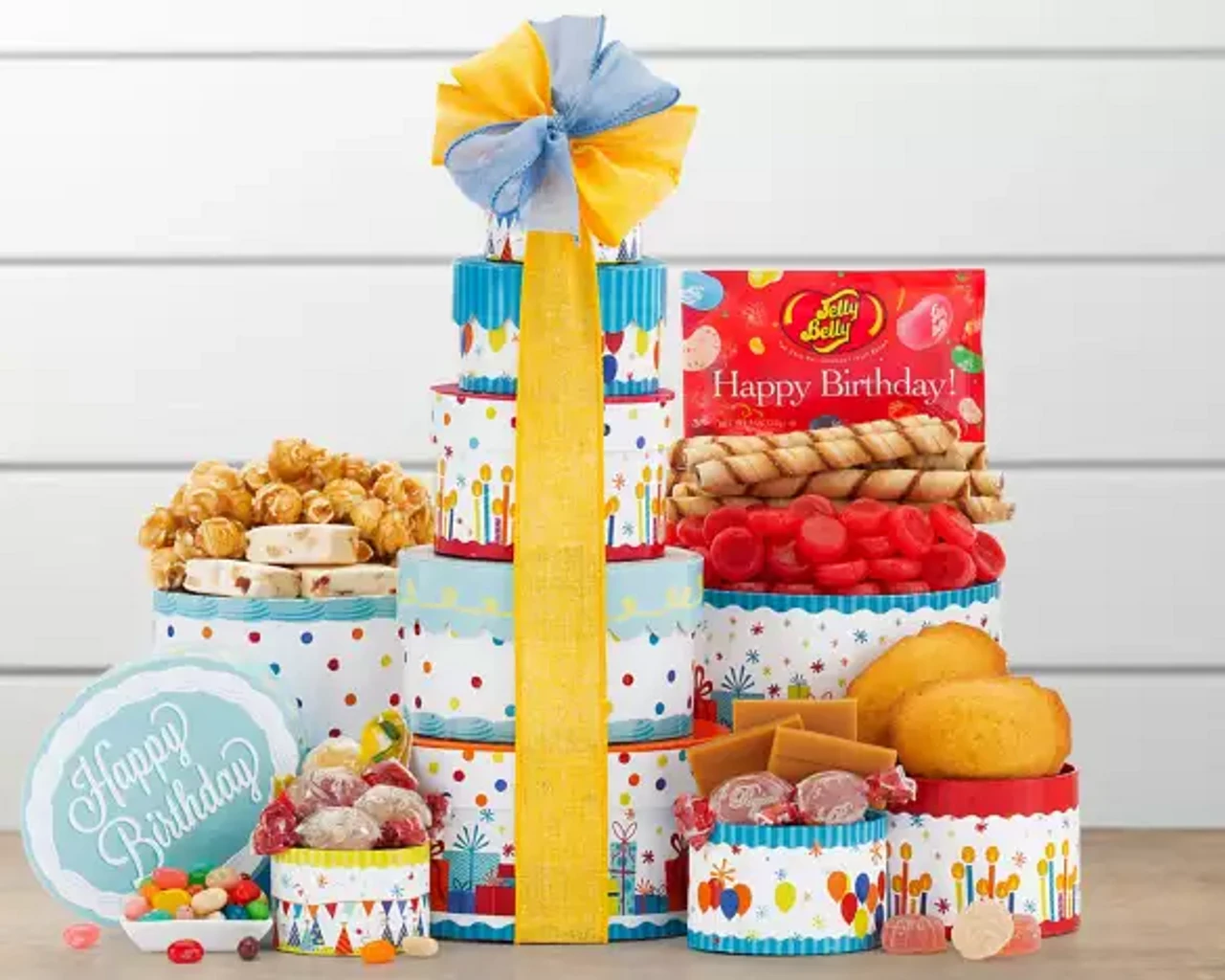 Celebrate birthdays with a burst of flavors in this exuberant Festive Birthday Tower! Packed high with gourmet delights, this tower includes colorful Jelly Belly jelly beans and moist madeleine cakes for a sweet touch. Add a bit of European flair with Pirouline chocolate hazelnut wafers and Italian fruit jellies in raspberry and blackberry flavors. The tower also features classic English fudge enriched with sea salt, spicy cinnamon candies, creamy caramel corn, and a medley of peanut fruit nougats. This stacked birthday gift is an exciting way to make anyone’s special day even more memorable.